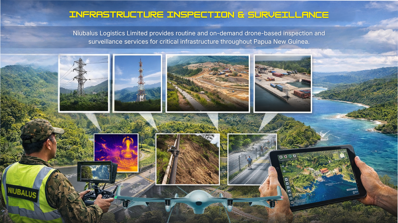 Infrastructure Inspection & Surveillance Niubalus Logistics Limited provides routine and on-demand drone-based inspection and surveillance services for critical infrastructure throughout Papua New Guinea. These services include monitoring of power transmission lines, telecommunications towers, pipelines, roads, bridges, ports, and mining operations—many of which are located in difficult or hazardous terrain. High-resolution imagery, thermal sensors, and automated […]